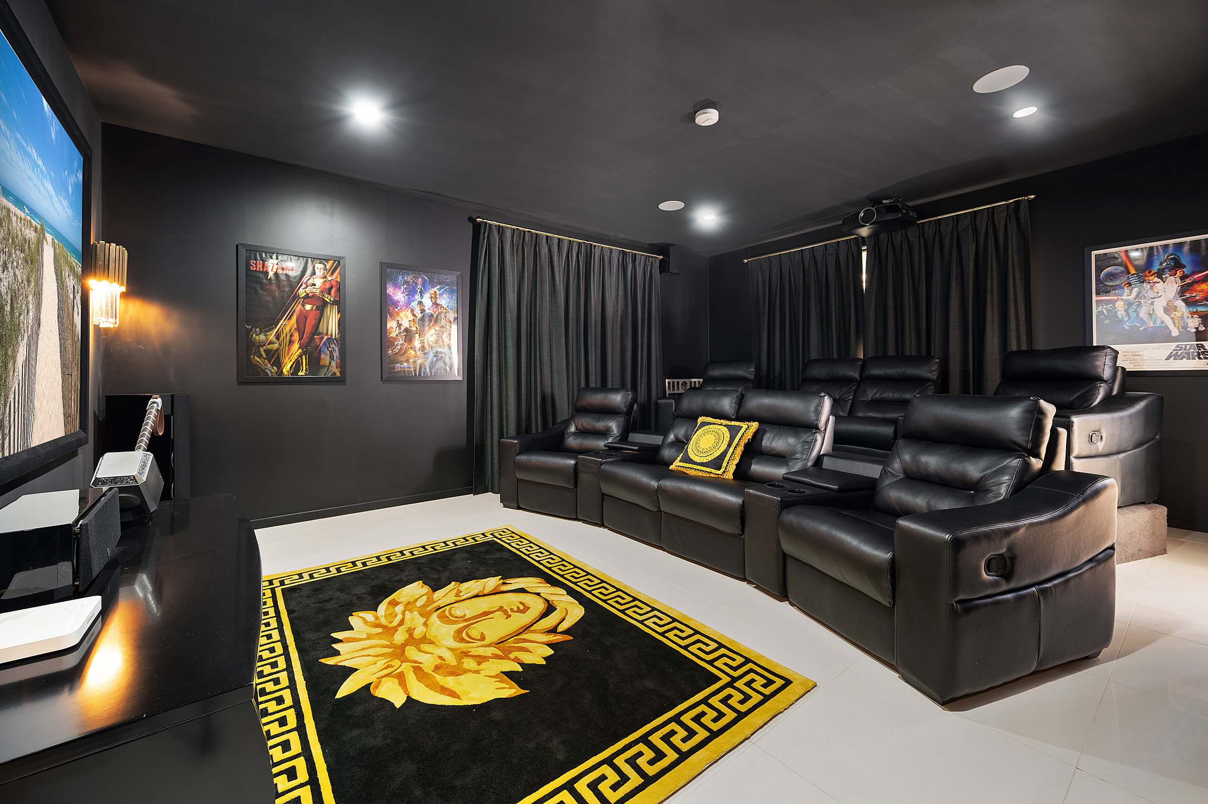 *8-person cinema with leather recliner seating, projector and sound system