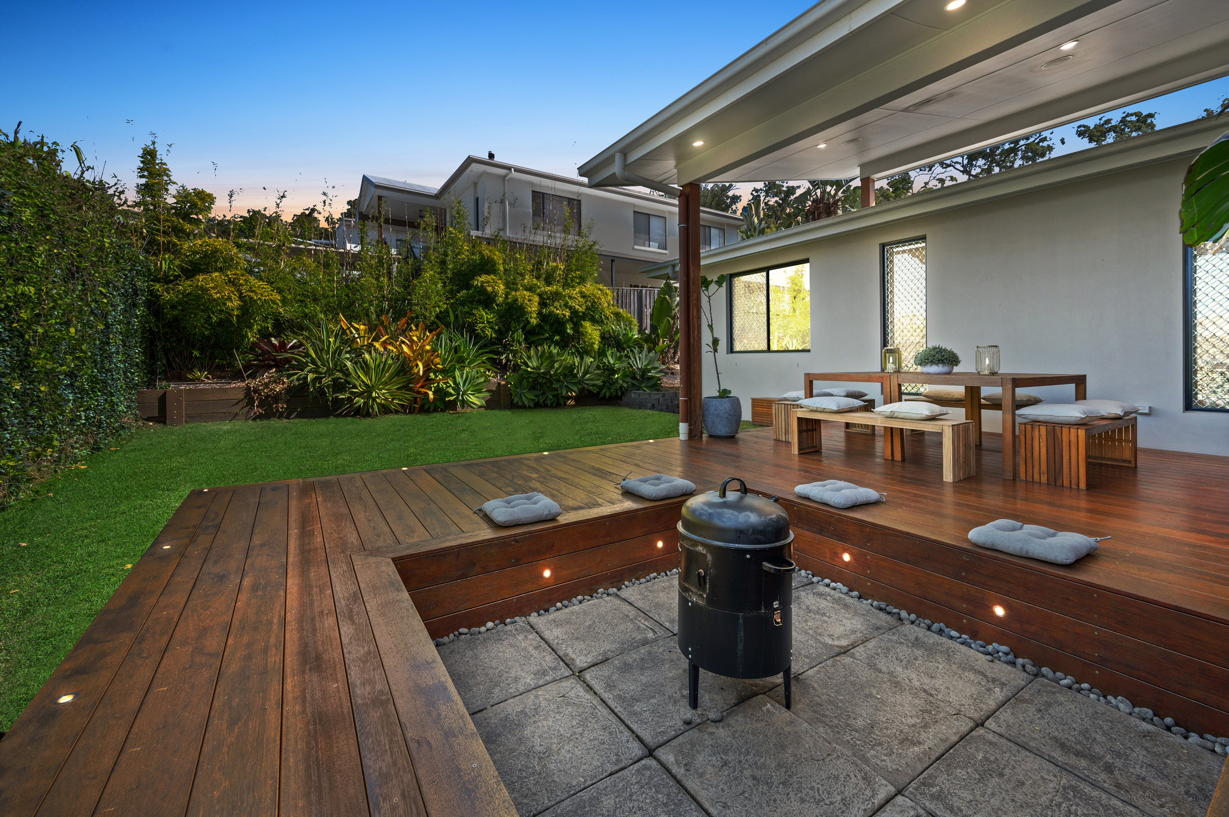 *Outdoor alfresco with timber decking and built-in fire pit