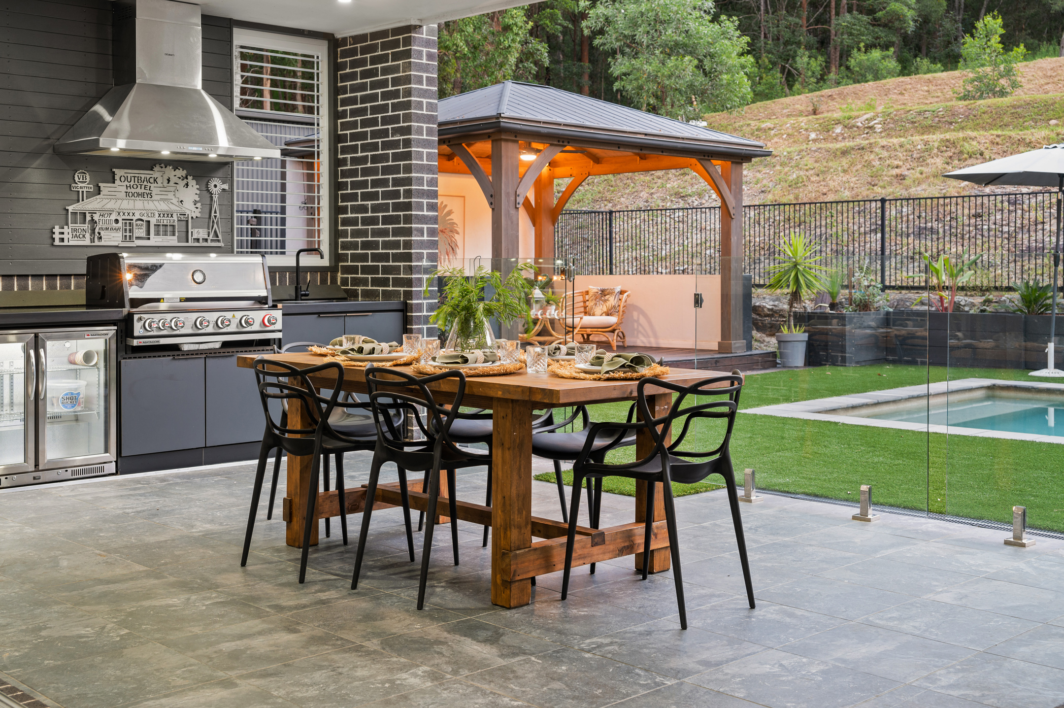 - Full outdoor kitchen with built-in BBQ and bar fridge