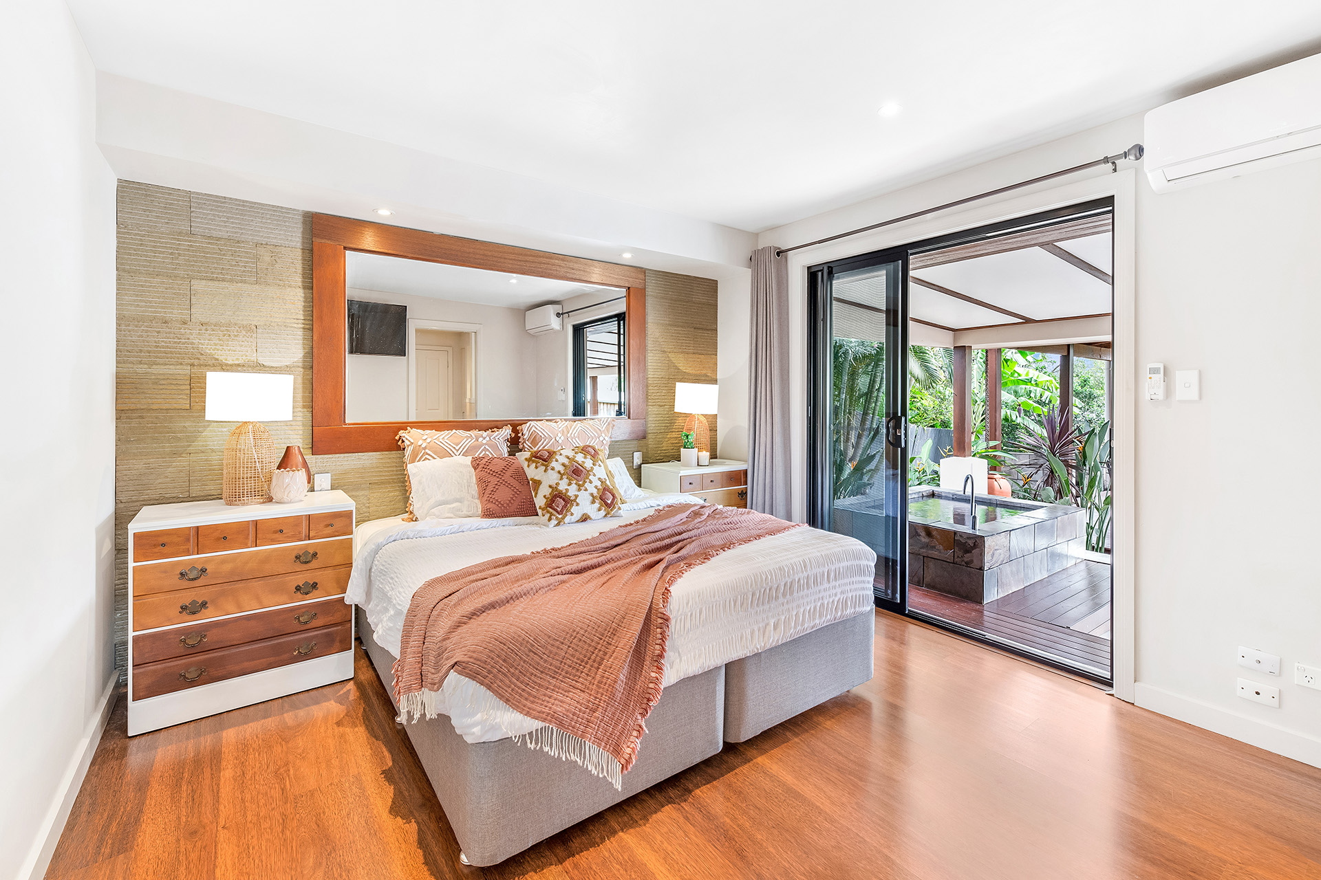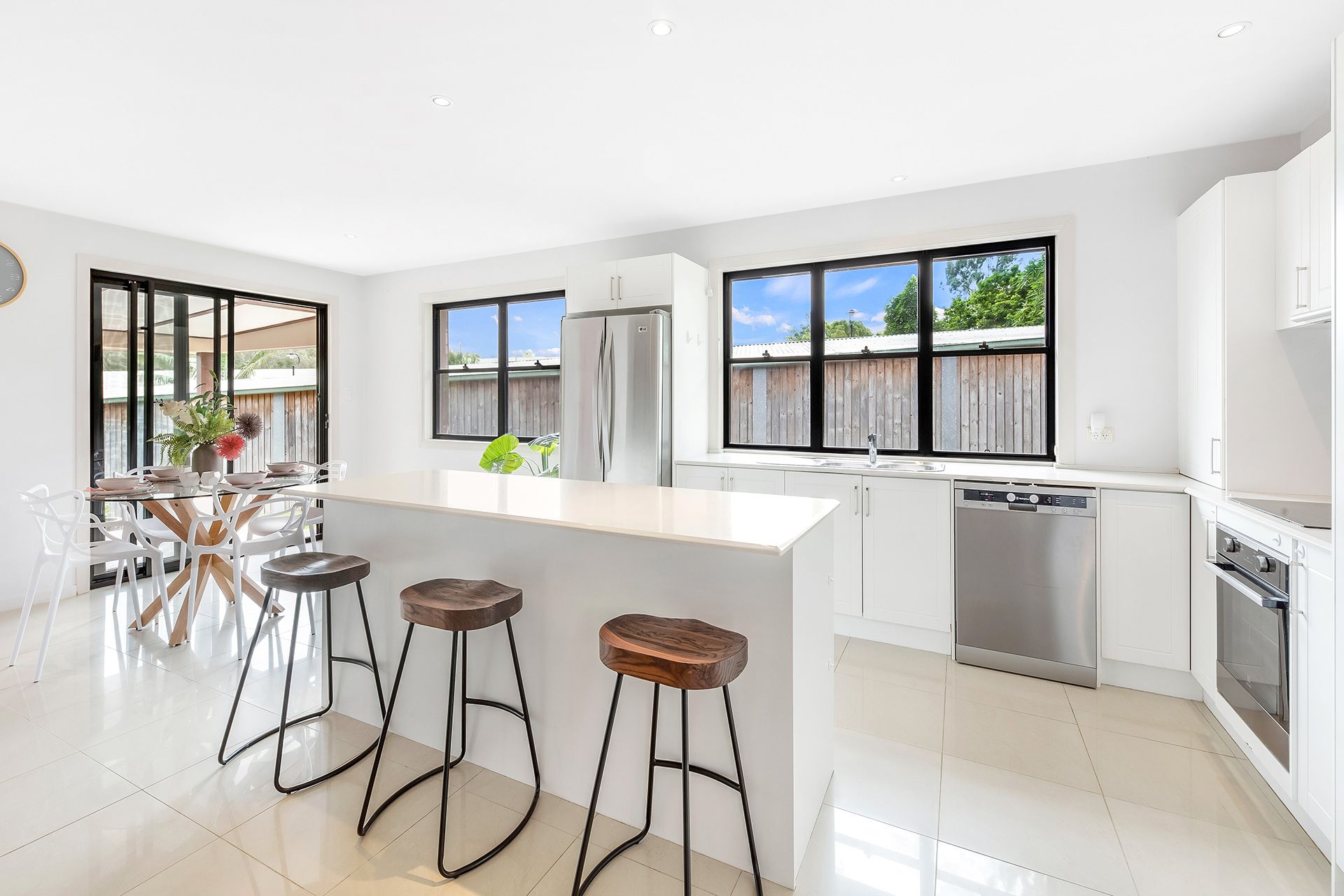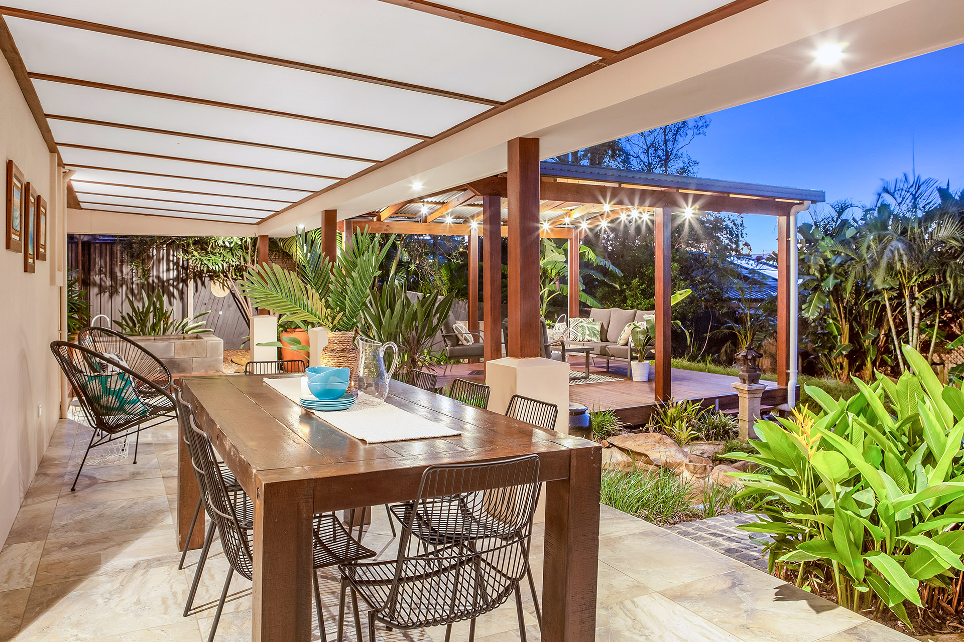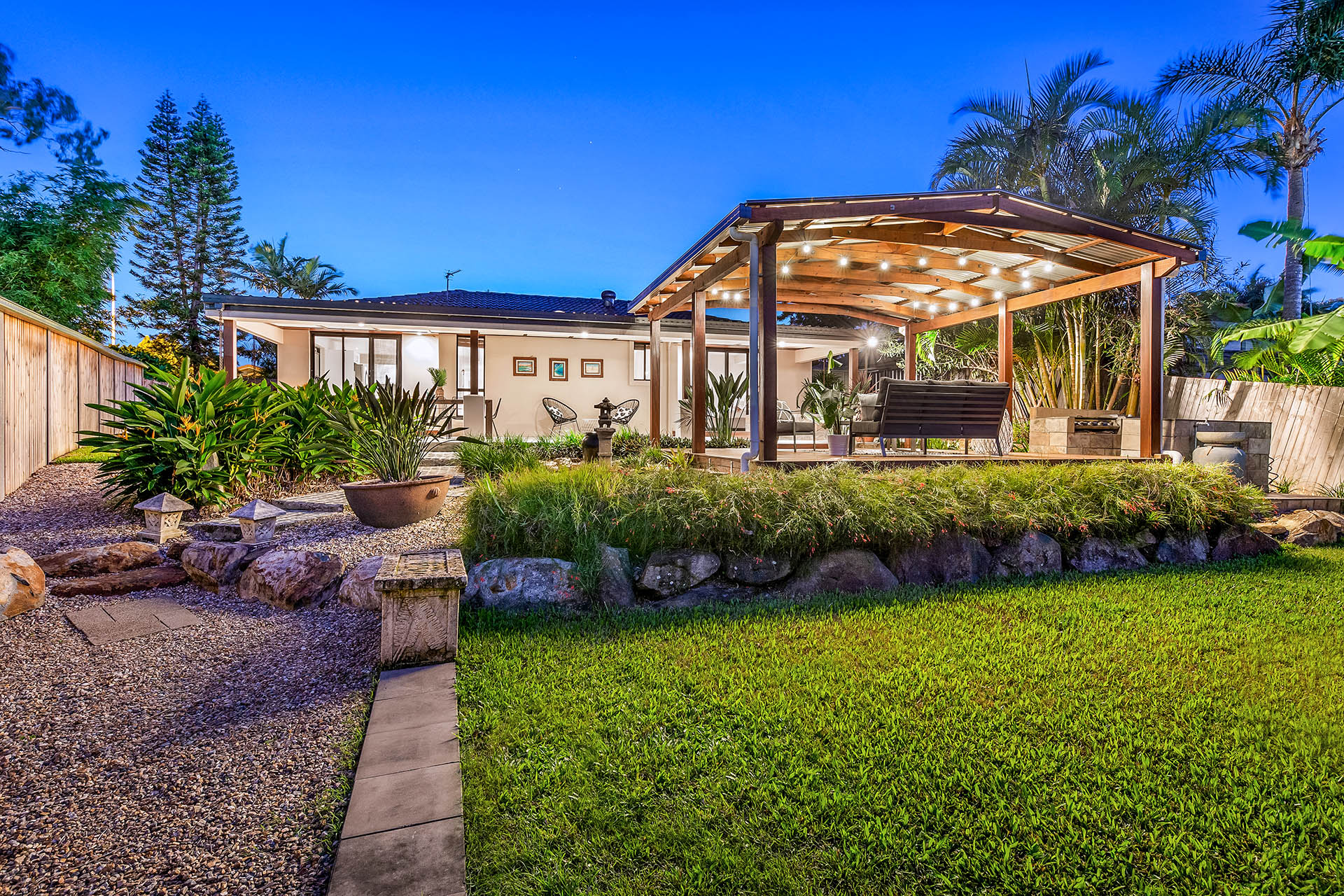 This home has been purposely designed around the idea of inside/outside living. With a seamless flow from the open plan kitchen/living/dining area to the vast outdoor patio and entertainers pavilion which is fitted with gorgeous festoon lights making it the ultimate backyard for hosting friends and family. The lush tropical landscaping and outdoor bath will definitely have you and your guests feeling like you’ve just taken a vacation every time you step outside. There is even the perfect spot for a pool and a grassed area overlooked by the kitchen, making it an ideal area for the kids to play.