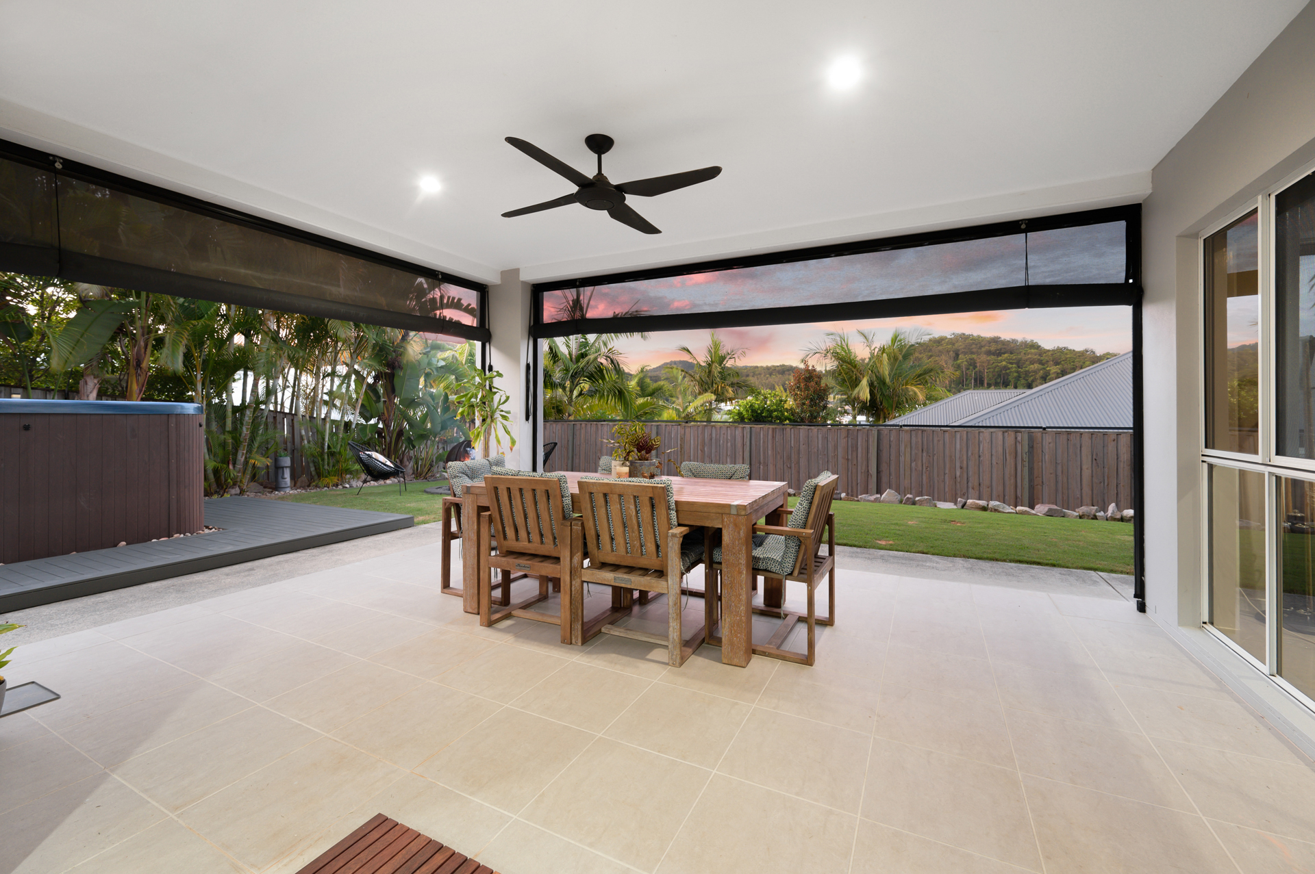 * Covered alfresco with outdoor screens to reduce the effects of wind and rain.